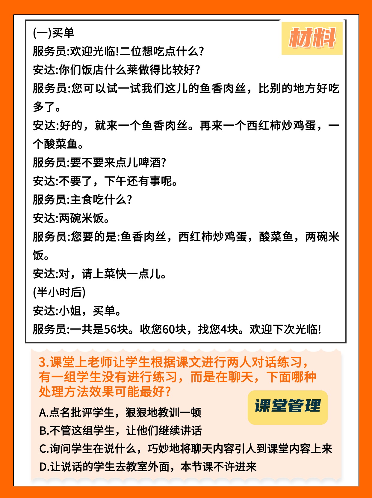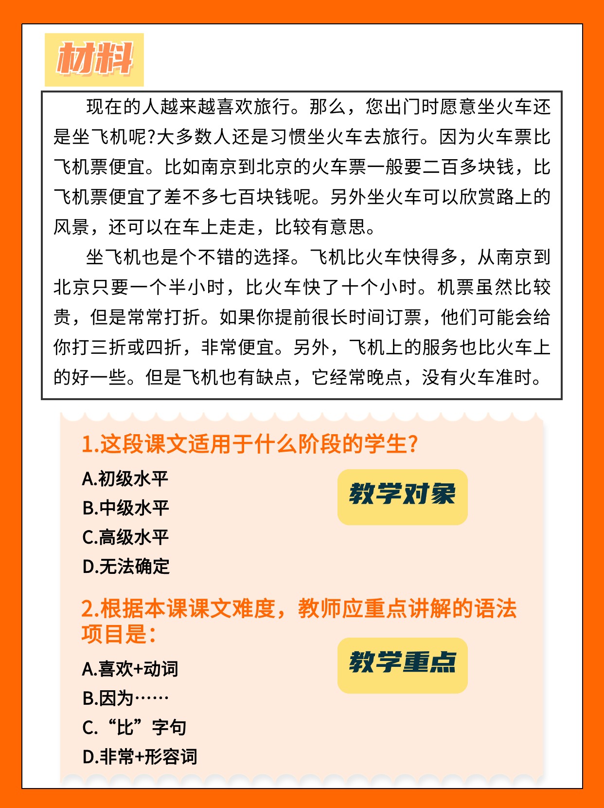 考点通常与教学对象、教学重点、教学步骤、应对课堂问题的方法、中华文化常识等方面有关。